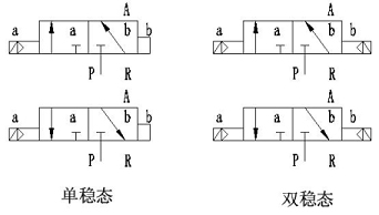 閥體兩端各有一個控制腔,兩個控制腔各有一個Φ2mm的先導孔與氣源壓力口(接口“P” )相通,氣源氣由先導閥來控制進入控制腔(接口“A” )。當一端線圈通電,磁力作用打開先導閥,氣源氣進入該端控制腔(接口“A” ),推動活塞帶動閥芯,改變工作狀態。閥體有單穩態和雙穩態兩種,單穩態閥線圈只有長期通電,電磁閥才能保持狀態,一旦掉電,馬上復位。雙穩態閥一旦線圈通電,閥位狀態改變后,即使掉電,仍保持現狀不變,只有當一端線圈通電時,閥位才會發生變化。