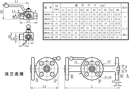 KHB3K型高壓三通球閥是依據國外資料研制而成,主要用于液壓管路中控制油液、氣的流通、流向和截止。本系列高壓多路球閥具有流阻損失小、密封性能可靠、操作方便、外觀精美等特點。本系列多路球閥主要由閥體、球體、閥桿、手柄和密封裝置等組成。閥體采用鋼質鍛件,表面鍍鉻。同時也提供不銹鋼球閥。本系列高壓球閥主要有二種連接方式:內螺紋連接、法蘭連接。